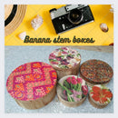 THE BANANA FIBRE PRODUCT ARE CRAFTED BY INDIVIDUALS FROM RURAL AREAS IN KARNATAKA THAT PROVIDE ECONOMIC AND SOCIAL SUPPORT TO THEIR DAILY LIVING. THE BOXES ARE MADE OF DRIED BANANA STEMS THAT IS OTHERWISE DISPOSED AFTER THE HARVEST OF THE FRUIT. THE INNER BOX IS MADE OF RECYCLED CARDBOARD WITH AVAILABLE FABRIC AND DECOUP OPTIONS.